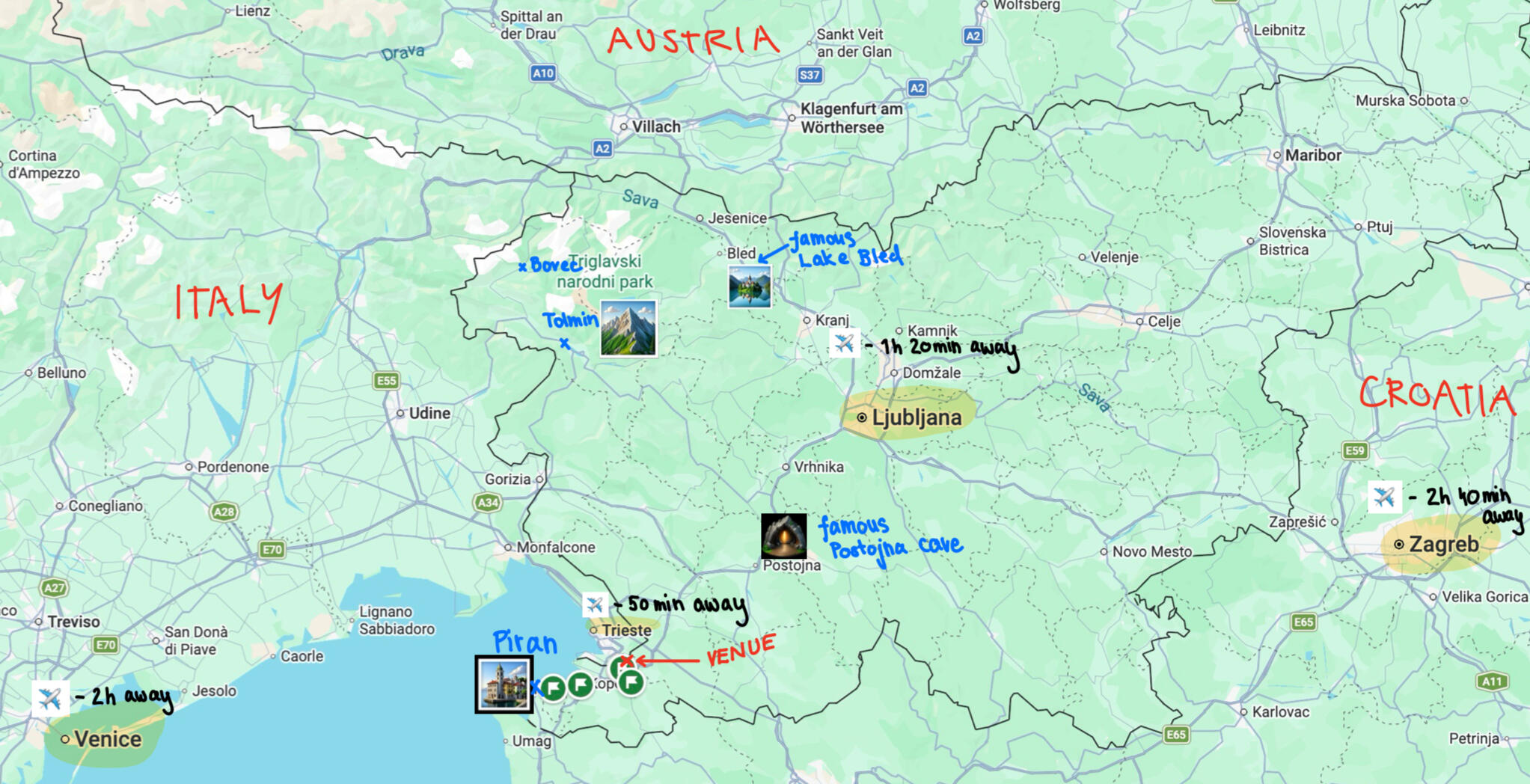 For many of you, this will be your first time in Slovenia (or even in Europe!). Slovenia is a small but incredibly beautiful country that truly offers something for everyone.The four most popular and iconic destinations are Lake Bled, Postojna Cave, the coastal town of Piran, and the capital city, Ljubljana—with its castle, museums, charming old town, and beautiful architecture. The famous Castello di Miramar is worth a short drive to Trieste, Italy, but you can find plenty of castles around Slovenia as well!For the more adventurous among you, we highly recommend exploring the northwestern region of Slovenia, known for its stunning mountain ranges, hiking trails, and crystal-clear rivers. If you’re not sure where to start, look into Bovec (great for hiking and adrenaline activities like ziplining, canyoning, and rafting), Tolmin Gorge, and Triglav National Park.Keep in mind that this area is not easily accessible by public transportation, so renting a car will make your adventure much smoother.If you’d like us to tailor recommendations to your specific travel plans, please don’t hesitate to reach out—we’d love to help!
